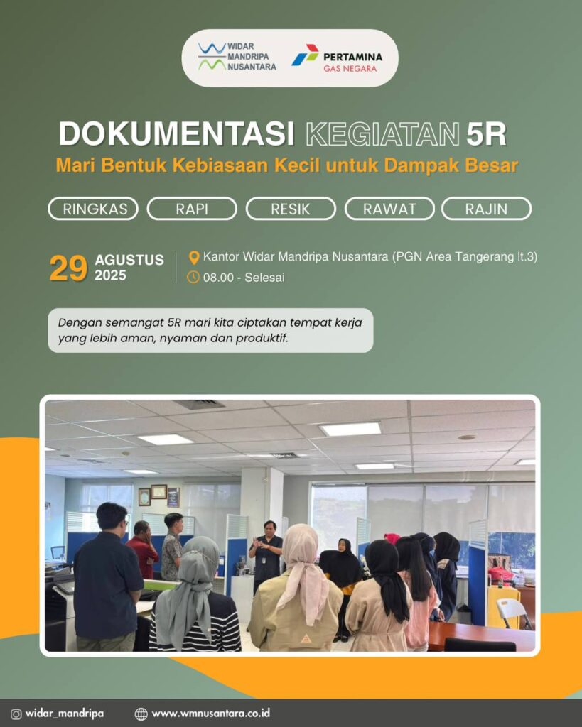 Widar’s Squad Gelar Kegiatan 5R untuk Ciptakan Lingkungan Kerja Nyaman Pada Jumat, 29 Agustus 2025, Widar’s Squad kembali melaksanakan kegiatan rutin bulanan 5R (Ringkas, Rapi, Resik, Rawat, dan Rajin) sebagai bentuk komitmen dalam menciptakan lingkungan kerja yang bersih, tertata, aman, nyaman, dan produktif bagi seluruh pekerja. Seluruh tim bersama-sama membersihkan meja kantor dari barang-barang yang